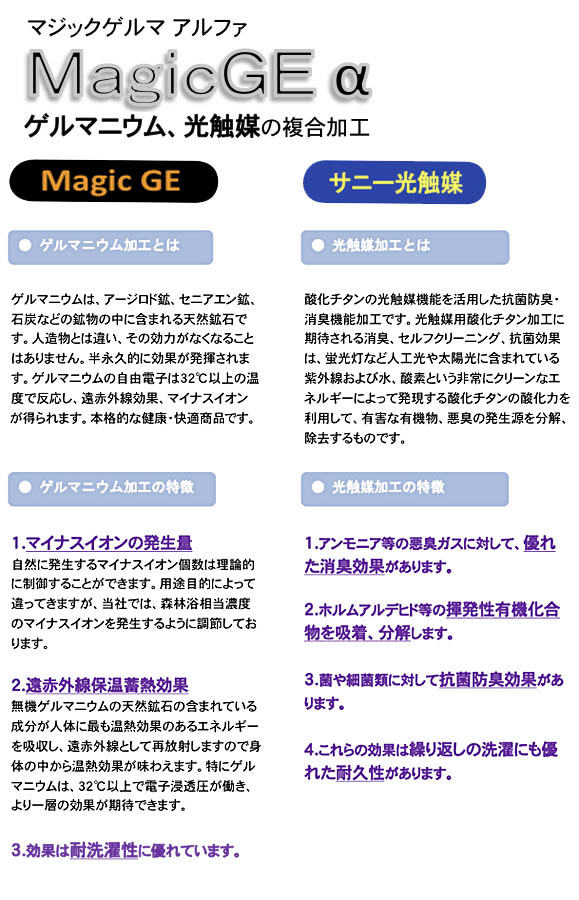 - 側には、ゲルマニウム加工を施した特殊な繊維素材を使用し、繊維から発生する、微量なエネルギーにより、森林浴のような爽やかな気分が楽しめます。